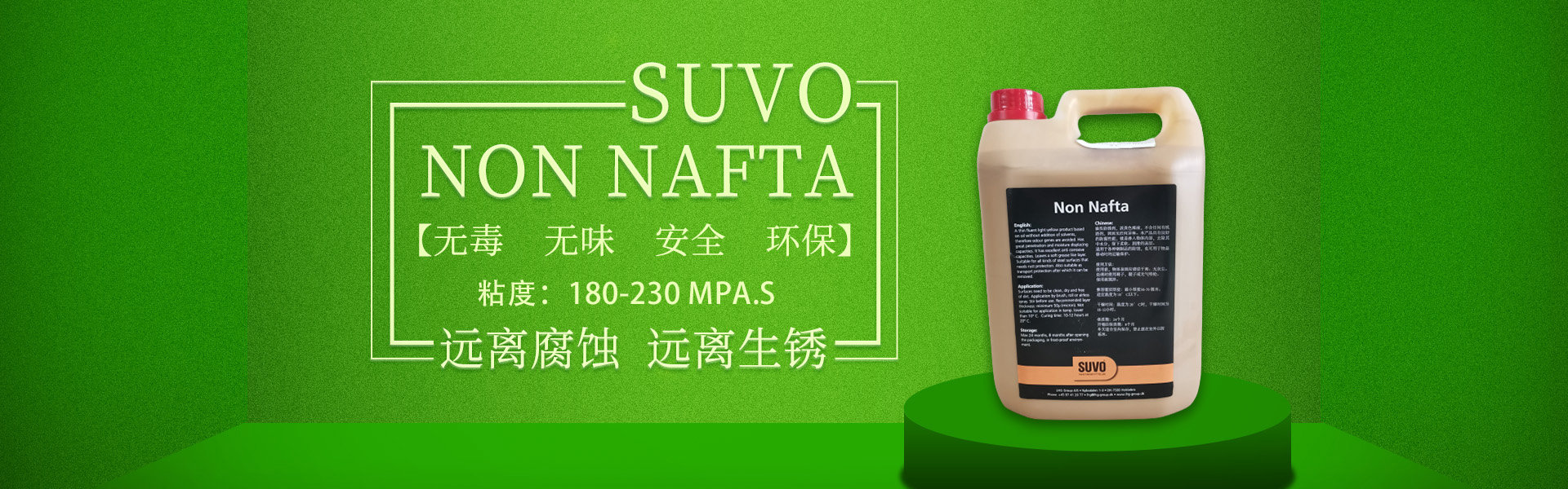 SUVO Non Nafta 是一款無(wú)毒、無(wú)味、安全、環(huán)保的油基/蠟基防銹產(chǎn)品,不含溶劑,內(nèi)含超強(qiáng)的防腐劑。 涂刷本產(chǎn)品后,會(huì)在被保護(hù)的工件表面形成一層80-100微米厚的油脂、蠟基保護(hù)膜,保護(hù)金屬產(chǎn)品免受惡劣環(huán)境侵害,遠(yuǎn)離腐蝕,遠(yuǎn)離生銹。 產(chǎn)品適合于鋼鐵制品在陸地存儲(chǔ)或海上運(yùn)輸過(guò)程中的長(zhǎng)期防腐,防銹。本產(chǎn)品非常易于被石油精/煤油清洗劑清除,清洗過(guò)程不損傷工件表面,不污染施工環(huán)境。